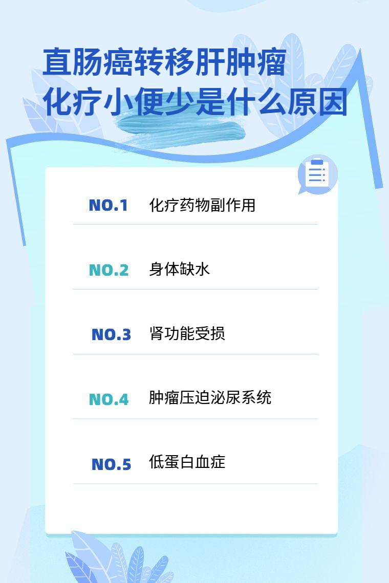 直肠癌转移肝肿瘤化疗后小便少常见原因有化疗药物副作用、身体缺水、肾功能受损、肿瘤压迫泌尿系统、低蛋白血症等。