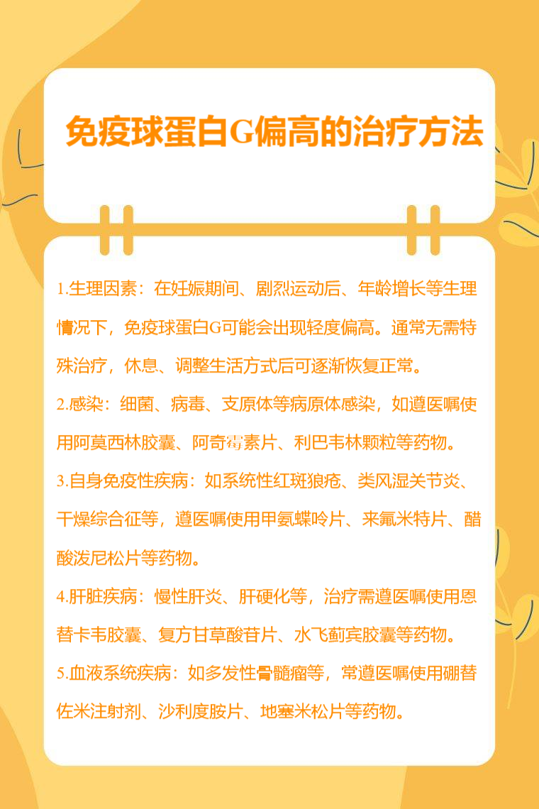 免疫球蛋白G偏高可能是生理因素、感染、自身免疫性疾病、肝脏疾病、血液系统疾病等因素,需要针对病因治疗,可采取的方法有调整生活方式、抗感染、免疫抑制、改善肝功能、治疗血液疾病等。