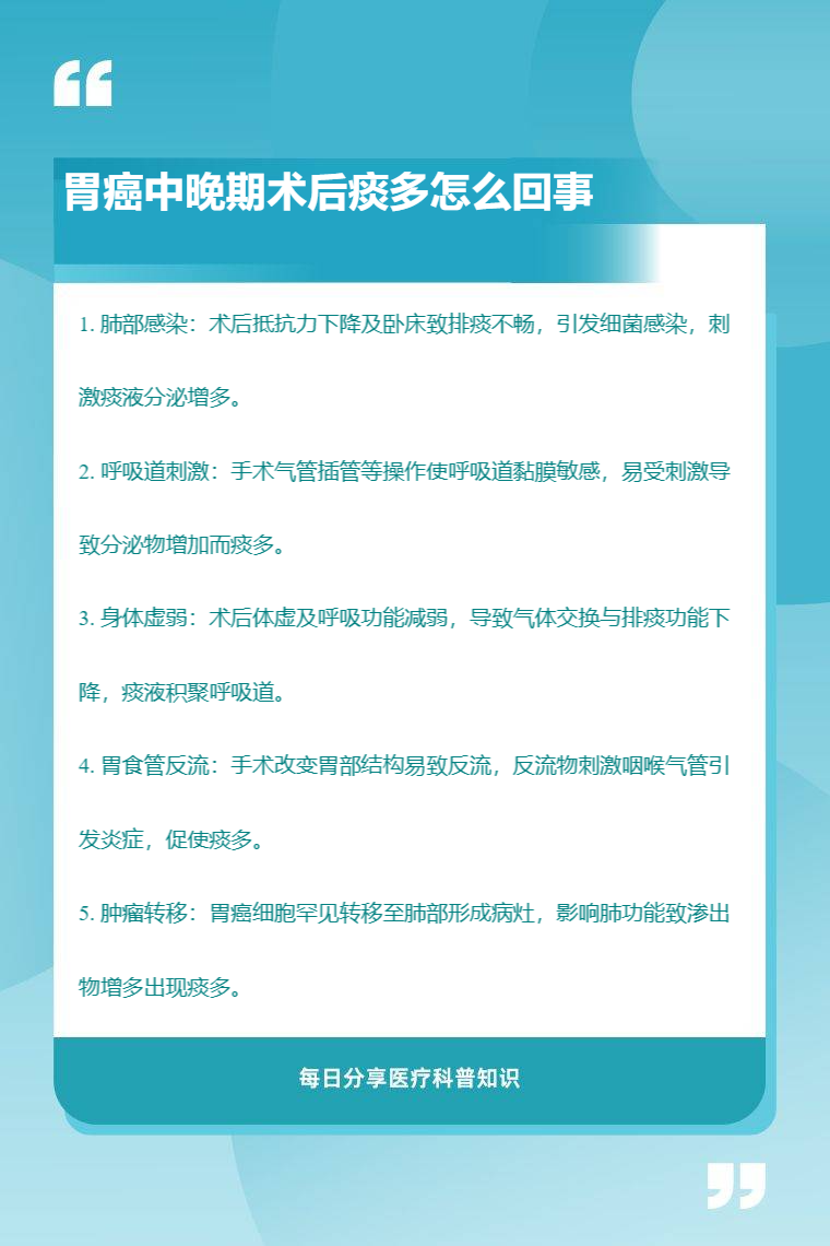 胃癌中晚期术后痰多可能由肺部感染、呼吸道刺激、身体虚弱、胃食管反流、肿瘤转移等情况引起等。