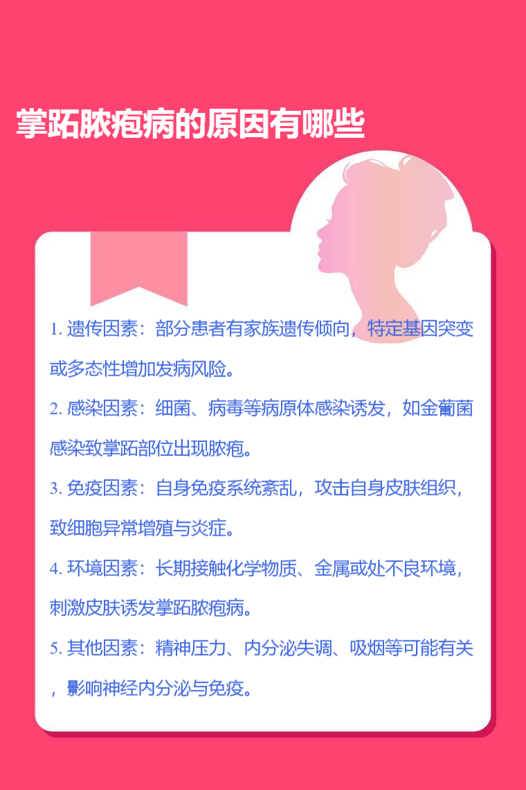 掌跖脓疱病的原因有遗传因素、感染因素、免疫因素、环境因素、其他因素等。