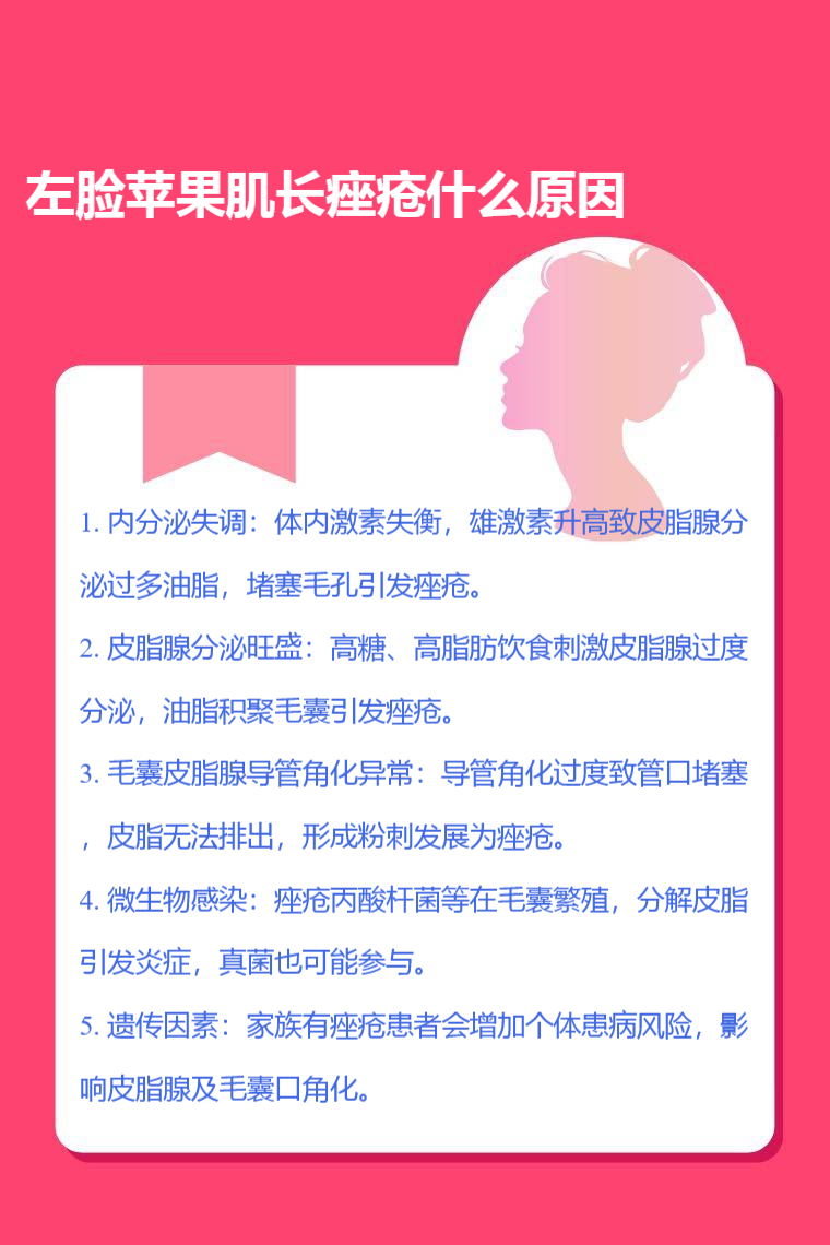 左脸苹果肌长痤疮的原因包括内分泌失调、皮脂腺分泌旺盛、毛囊皮脂腺导管角化异常、微生物感染、遗传因素等。