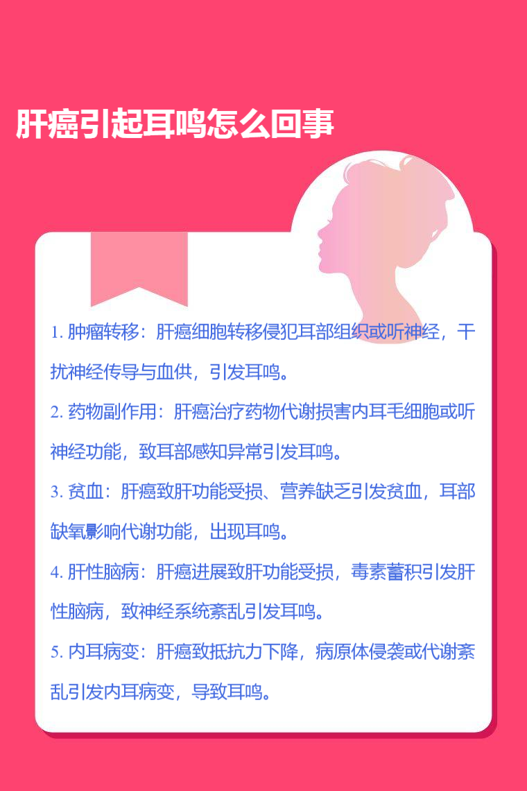 2. 药物副作用:肝癌治疗过程中使用的一些药物,如化疗药、靶向药等,可能存在副作用影响耳部。这些药物在体内代谢时,损害内耳的毛细胞或影响听神经功能,使耳部感知声音的能力出现异常,最终引发耳鸣。