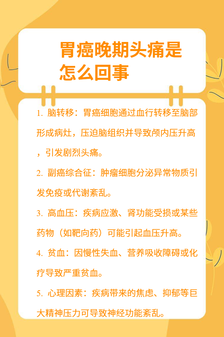 胃癌晚期头痛可能由脑转移、副癌综合征、高血压、贫血、心理因素等引起。