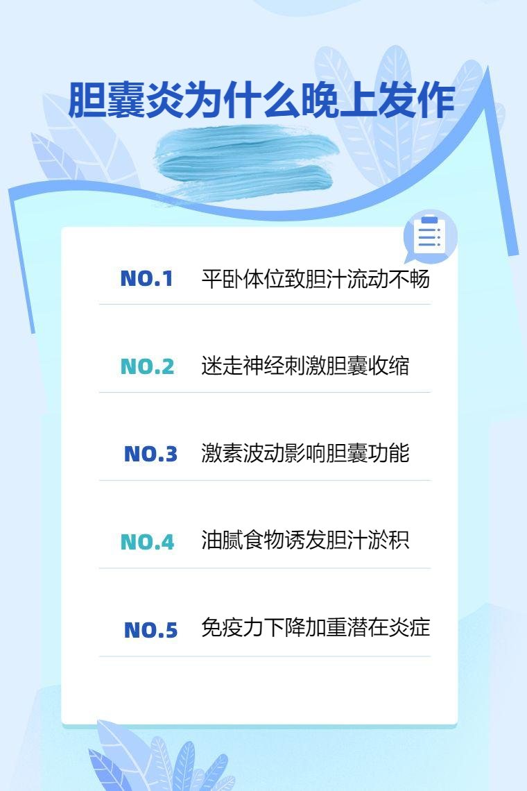 3. 夜间激素水平变化:在夜间,人体的激素水平会出现一些变化,某些激素的波动可能影响胆囊的正常生理功能,比如影响胆囊的收缩和胆汁的分泌、排泄等,导致胆囊内环境发生改变,增加胆囊炎发作的几率。
