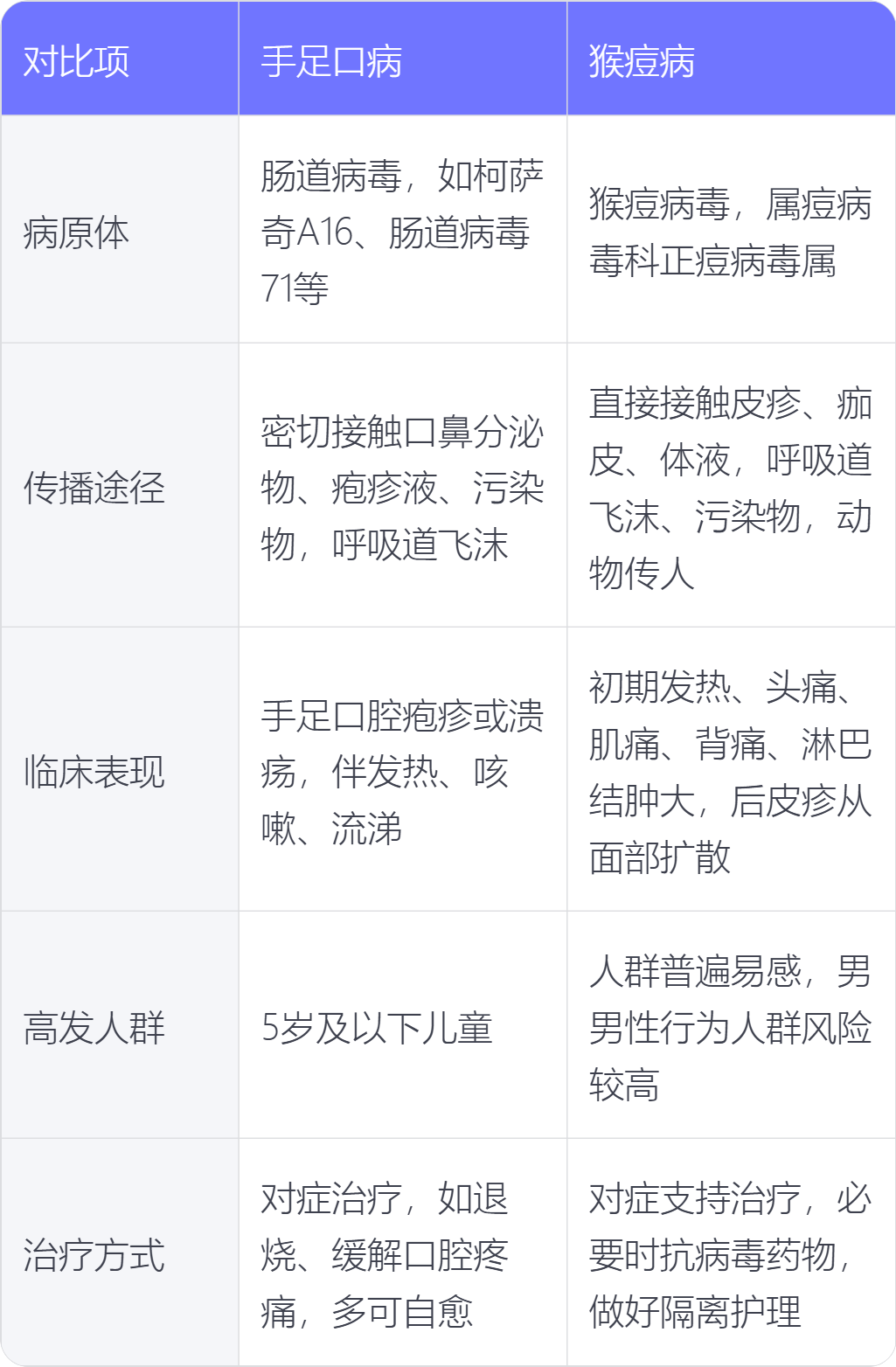 手足口病与猴痘病在病原体、传播途径、临床表现、高发人群、治疗方式上存在不同。