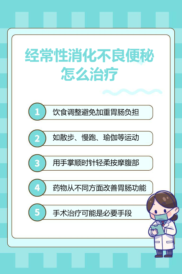 经常性消化不良便秘可通过饮食调整、适当运动、腹部按摩、药物治疗、手术治疗等方法来应对。