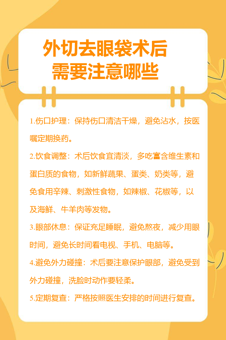 外切去眼袋术后需注意伤口护理、饮食调整、眼部休息、避免外力碰撞、定期复查等。