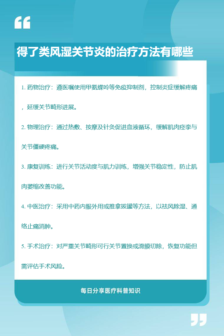 类风湿关节炎的治疗方法有药物治疗、物理治疗、康复训练、中医治疗、手术治疗等。