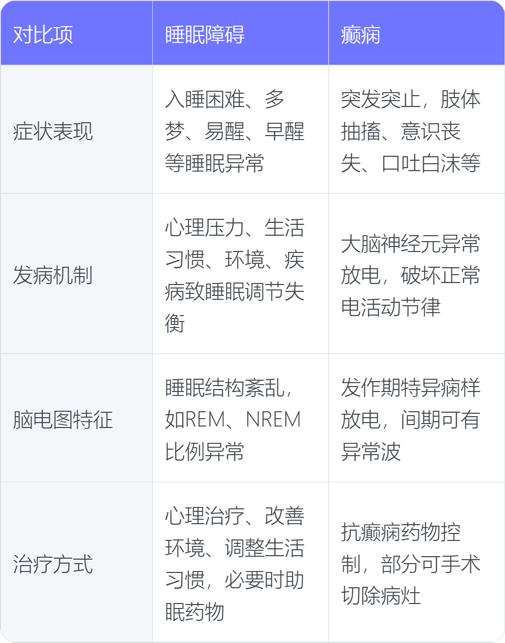 睡眠障碍与癫痫在症状表现、发病机制、脑电图特征、治疗方式上存在不同。