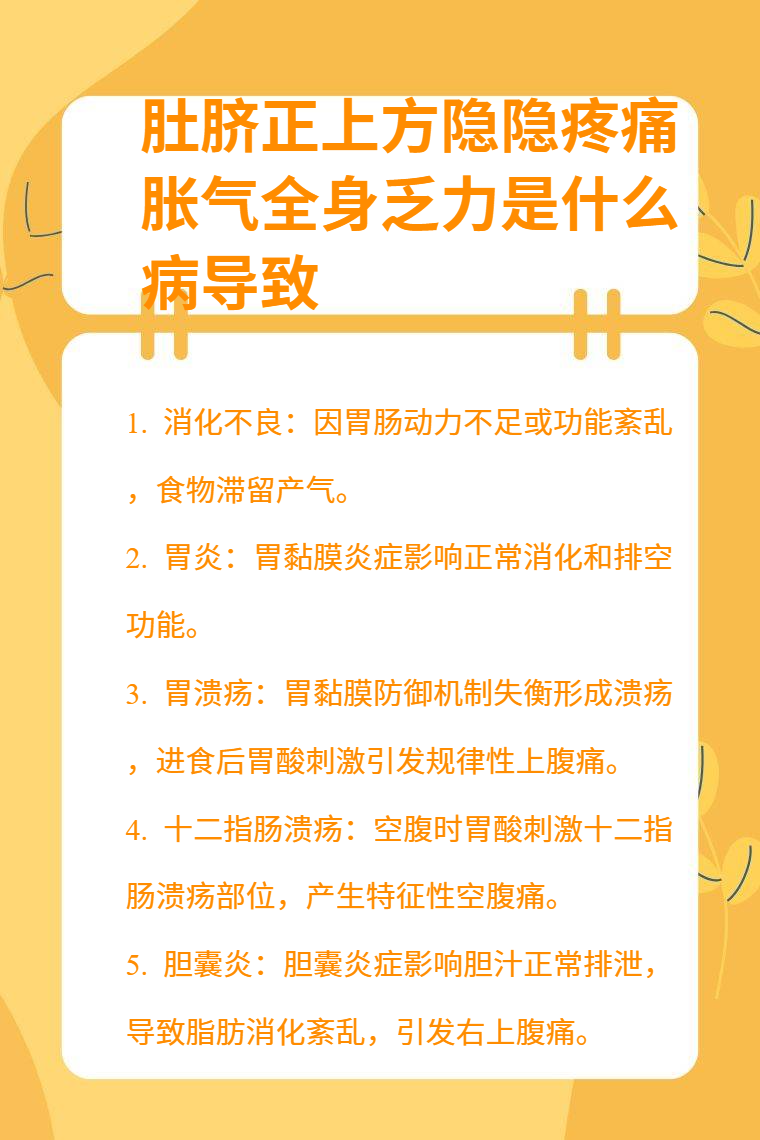 肚脐正上方隐隐疼痛、胀气且全身乏力可能由消化不良、胃炎、胃溃疡、十二指肠溃疡、胆囊炎等疾病导致。