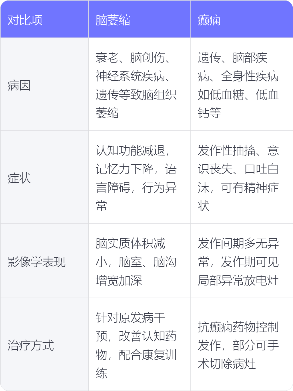 脑萎缩与癫痫在病因、症状、影像学表现、治疗方式上存在不同。