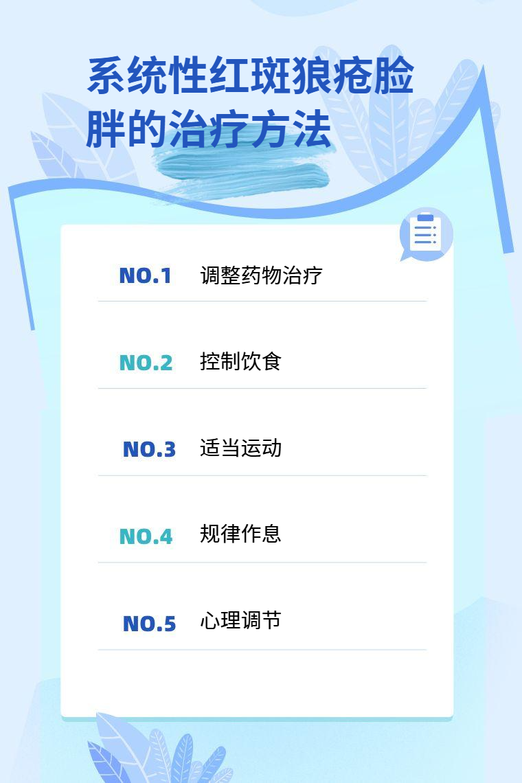 系统性红斑狼疮脸胖可通过调整药物治疗、控制饮食、适当运动、规律作息、心理调节等方法来改善。