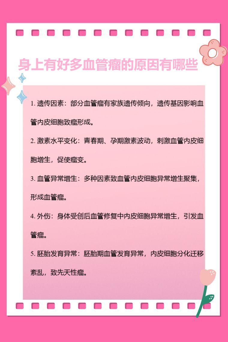 身上出现好多血管瘤的原因有遗传因素、激素水平变化、血管异常增生、外伤、胚胎发育异常等。