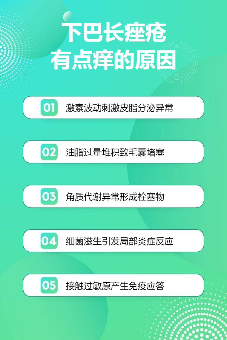 1. 内分泌失调:内分泌系统失衡时,雄激素水平相对升高,刺激皮脂腺增大并分泌更多油脂,过多油脂无法及时排出,积聚在毛囊内,为痤疮丙酸杆菌等微生物的生长提供适宜环境,从而引发痤疮,炎症刺激周围神经导致瘙痒。青春期、生理期、孕期等特殊时期,内分泌变化较大,下巴容易出现这种情况。
