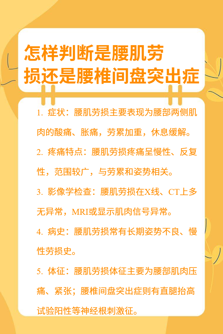 判断是腰肌劳损还是腰椎间盘突出症可从症状、疼痛特点、影像学检查、病史、体征等方面入手。