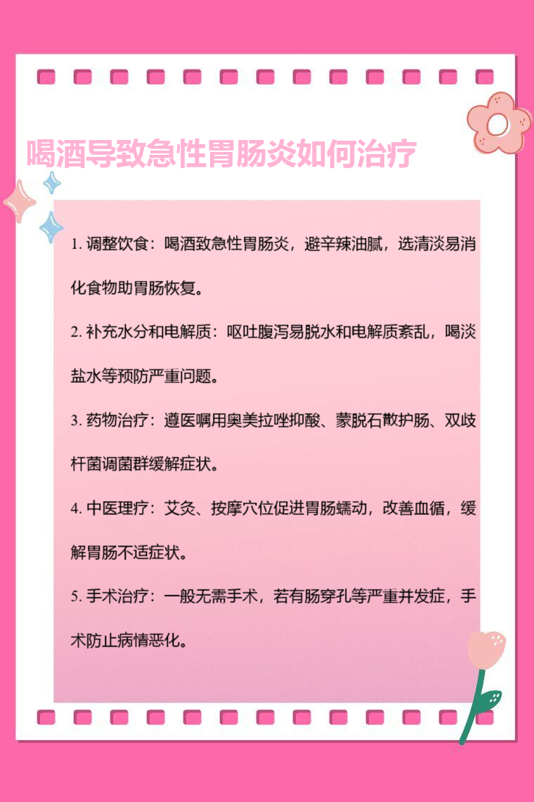 喝酒导致急性胃肠炎可通过调整饮食、补充水分和电解质、药物治疗、中医理疗、手术治疗等方法进行治疗。