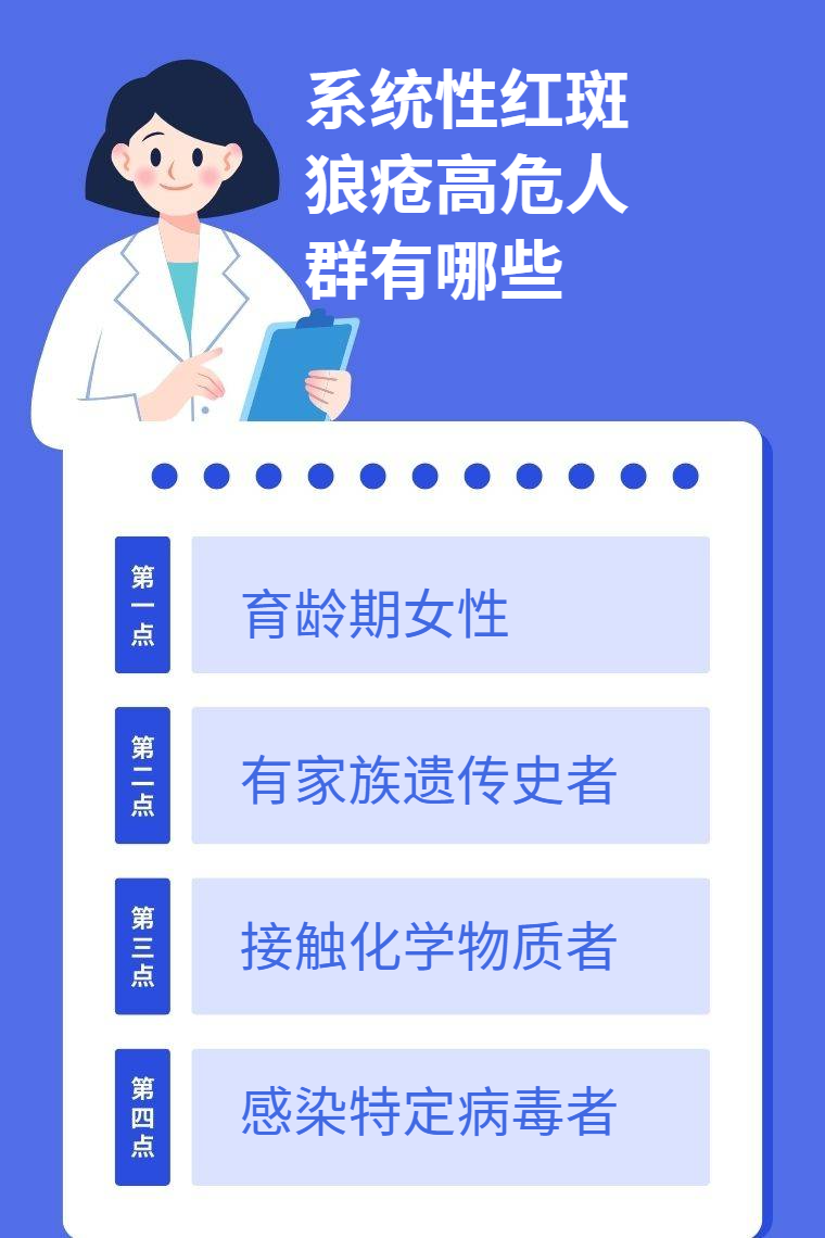 系统性红斑狼疮高危人群包括育龄期女性、有家族遗传史者、长期接触化学物质者、感染特定病毒者等。