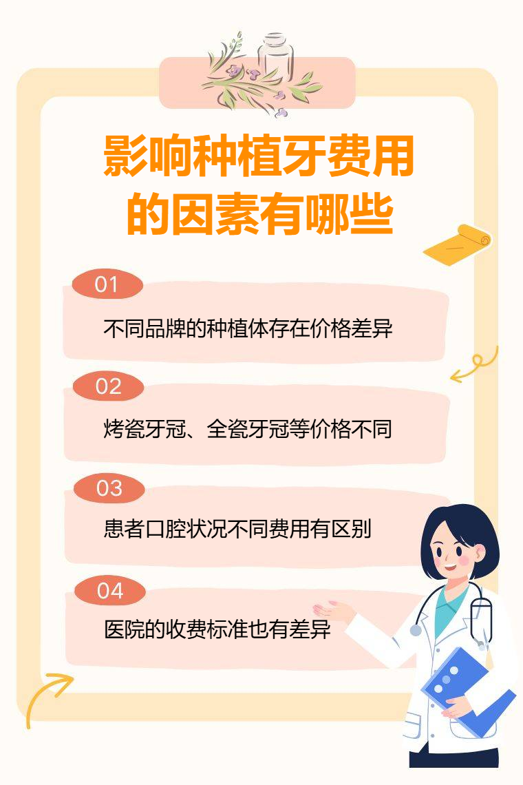 种植牙费用受种植体品牌、牙冠材料、患者口腔状况、医院地区等因素影响。