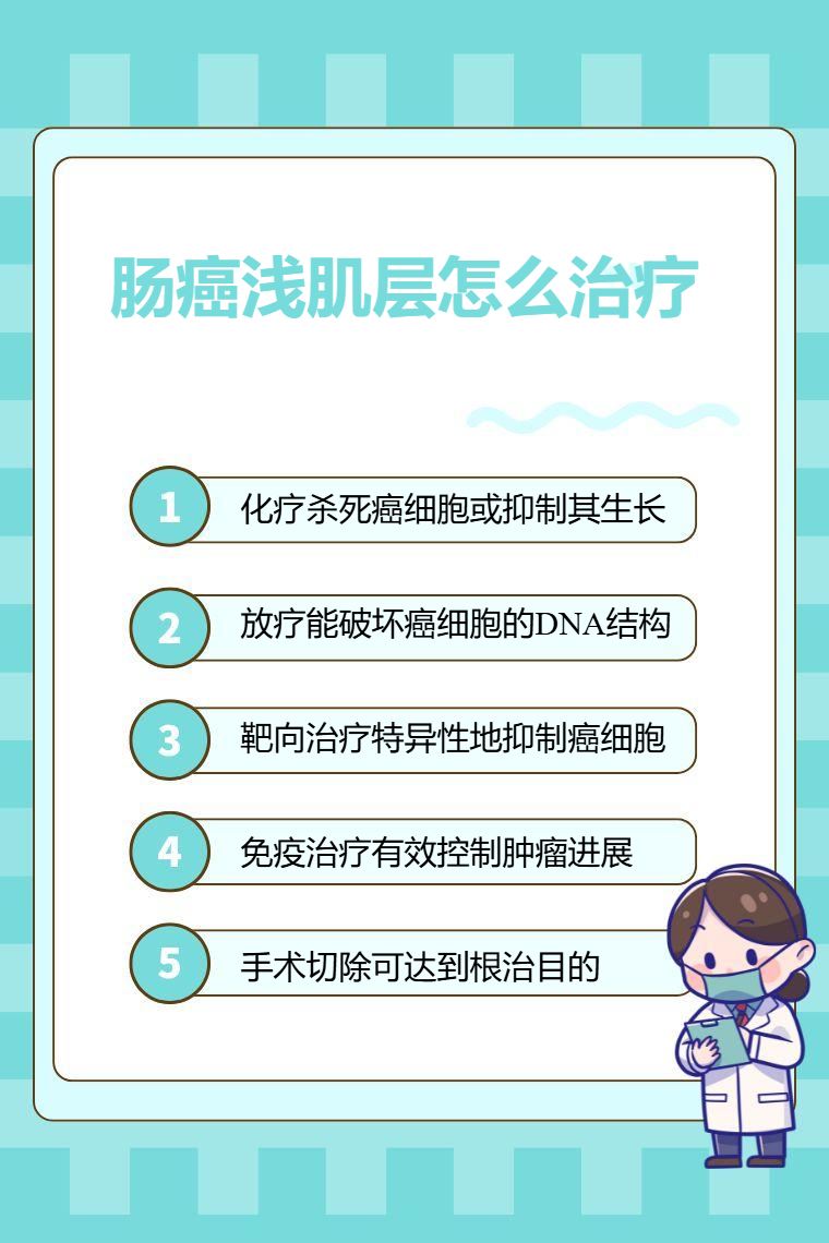 肠癌浅肌层的治疗方法主要有化疗、放疗、靶向治疗、免疫治疗、手术治疗等。
