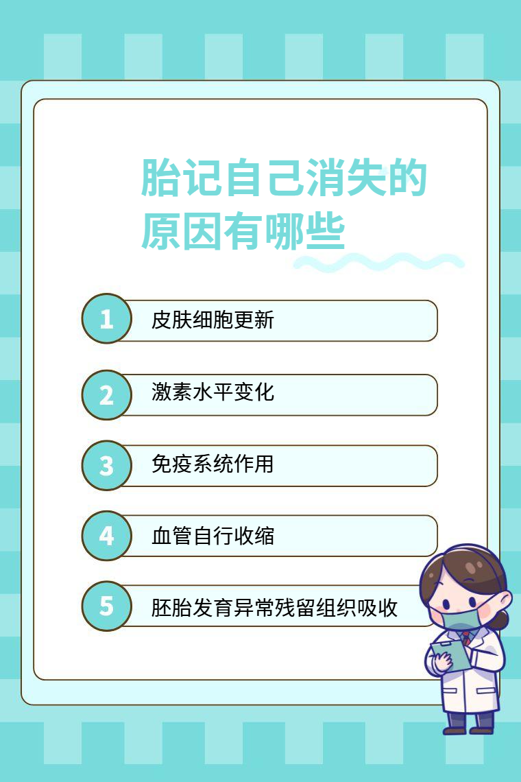 胎记自己消失的原因有皮肤细胞更新、激素水平变化、免疫系统作用、血管自行收缩、胚胎发育异常残留组织吸收等。