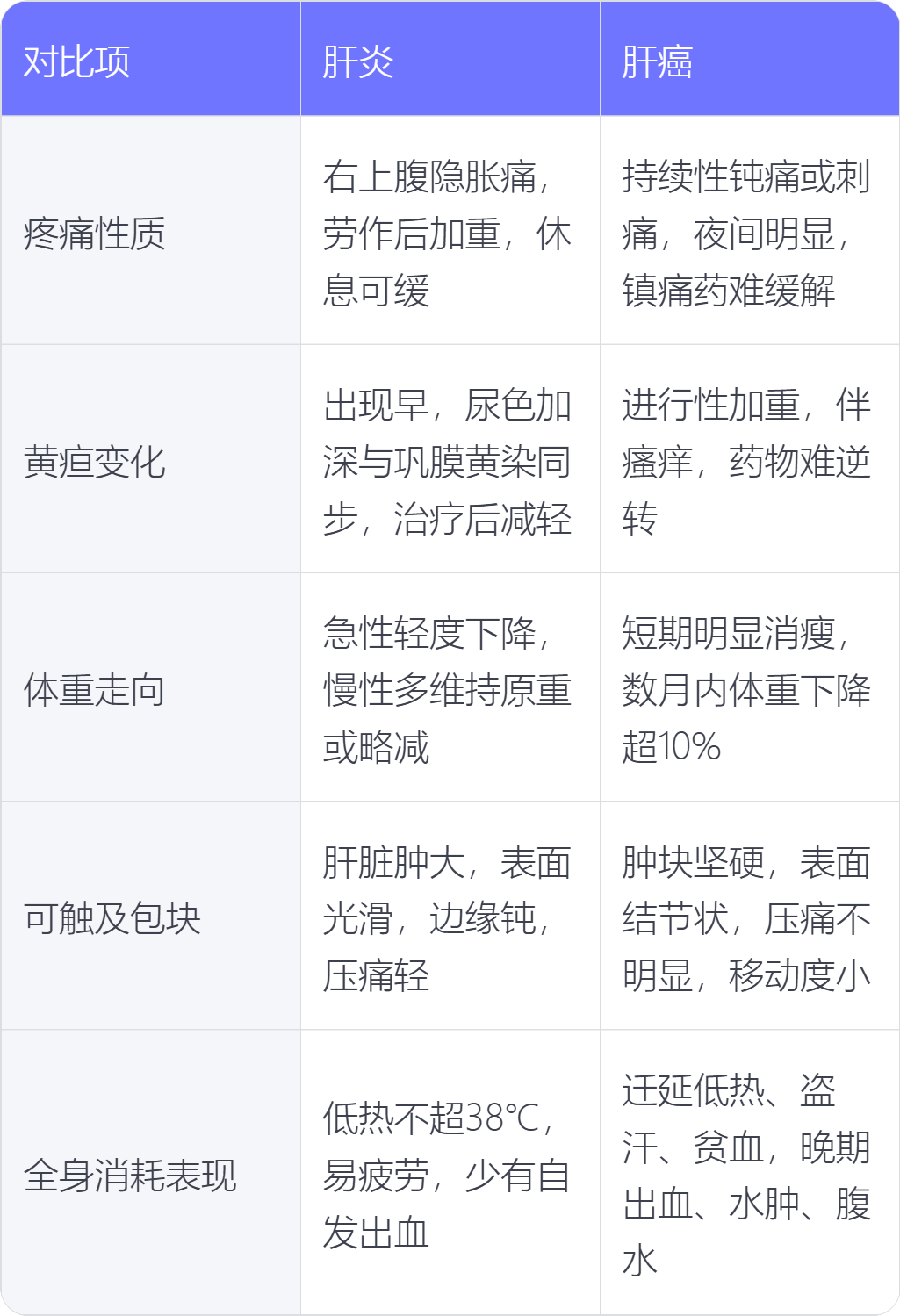 肝炎常以乏力、食欲差、黄疸、上腹隐痛、低热为信号,肝癌则以体重骤降、持续肝区钝痛、进行性黄疸、腹部包块、反复低热及出血倾向示警,二者在疼痛性质、黄疸变化、体重走向、可触及包块、全身消耗表现各不相同。