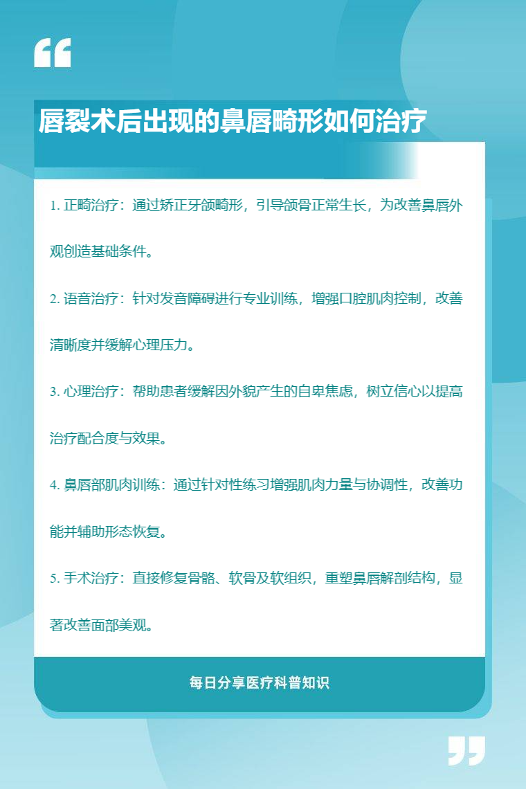 唇裂术后出现的鼻唇畸形可通过正畸治疗、语音治疗、心理治疗、鼻唇部肌肉训练、手术治疗等进行改善。