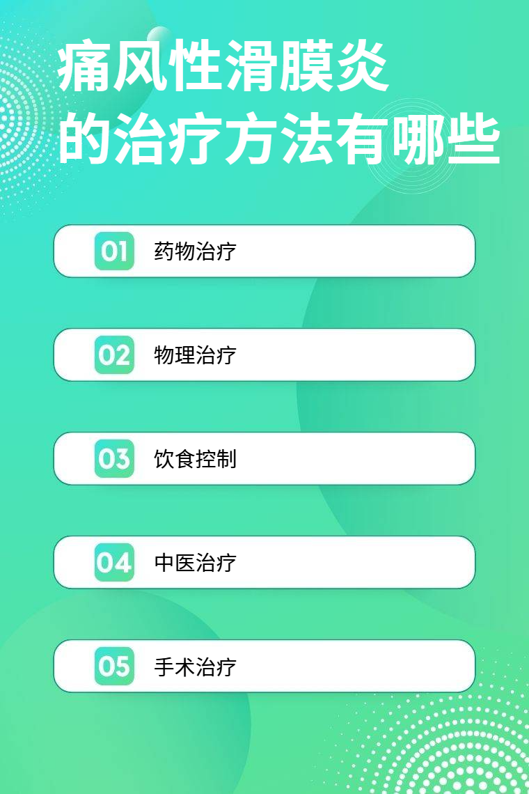 痛风性滑膜炎的治疗方法有药物治疗、物理治疗、饮食控制、中医治疗、手术治疗等。
