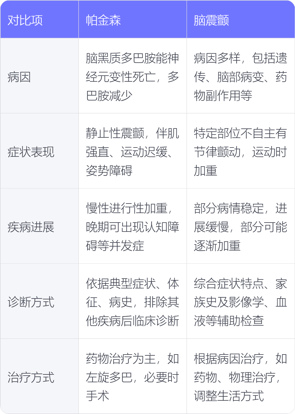1. 病因:帕金森主要由脑部黑质多巴胺能神经元变性死亡,导致多巴胺分泌减少引发;脑震颤病因多样,包括遗传因素、脑部病变、药物副作用、代谢异常等。