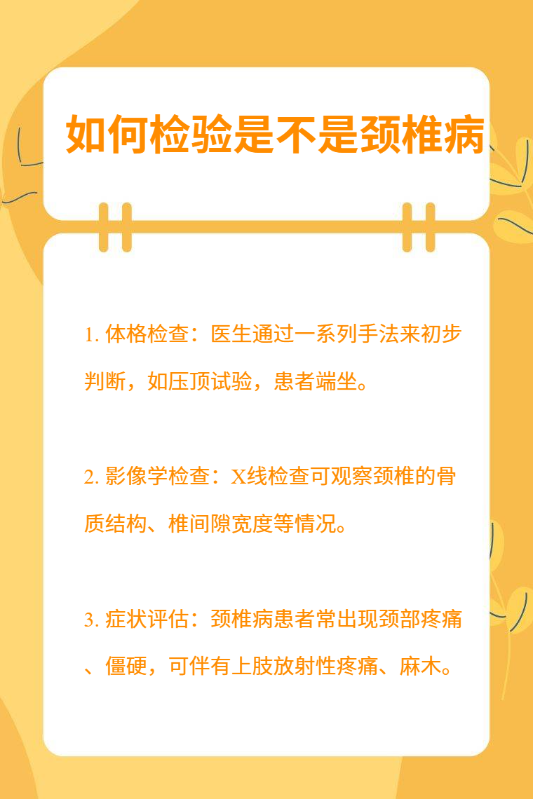 检验是否为颈椎病可通过体格检查、影像学检查、症状评估等。