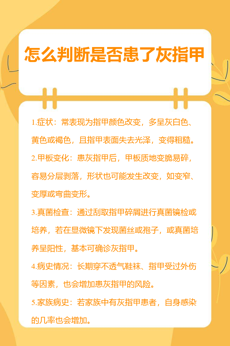 判断是否患灰指甲可从症状、甲板变化、真菌检查、病史情况、家族病史等方面入手。