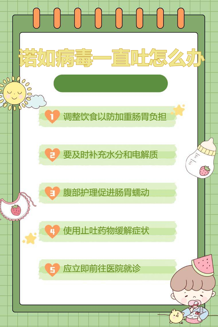 诺如病毒一直吐可通过调整饮食、补充水分、腹部护理、药物治疗、及时就医等应对。