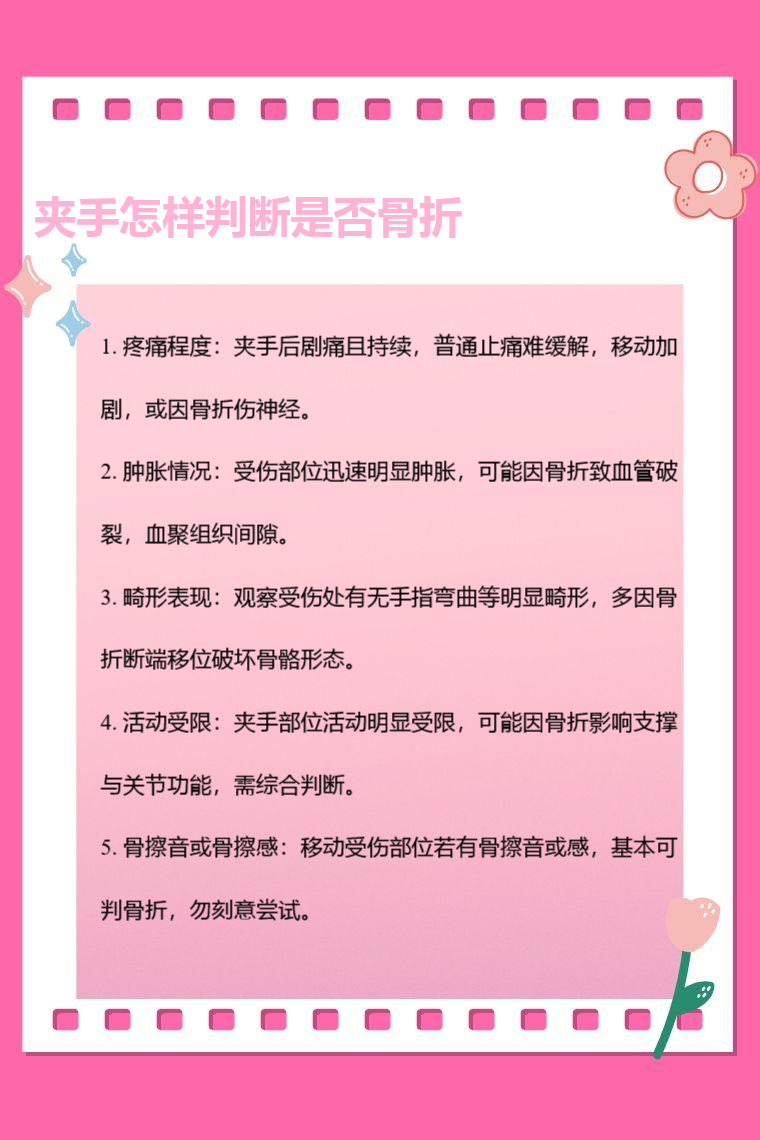 1. 疼痛程度:若夹手后出现剧烈且持续的疼痛,普通止痛方式难以缓解,尤其是在移动受伤部位时疼痛明显加剧,很可能发生了骨折。因为骨折会损伤周围神经组织,引发强烈疼痛信号。