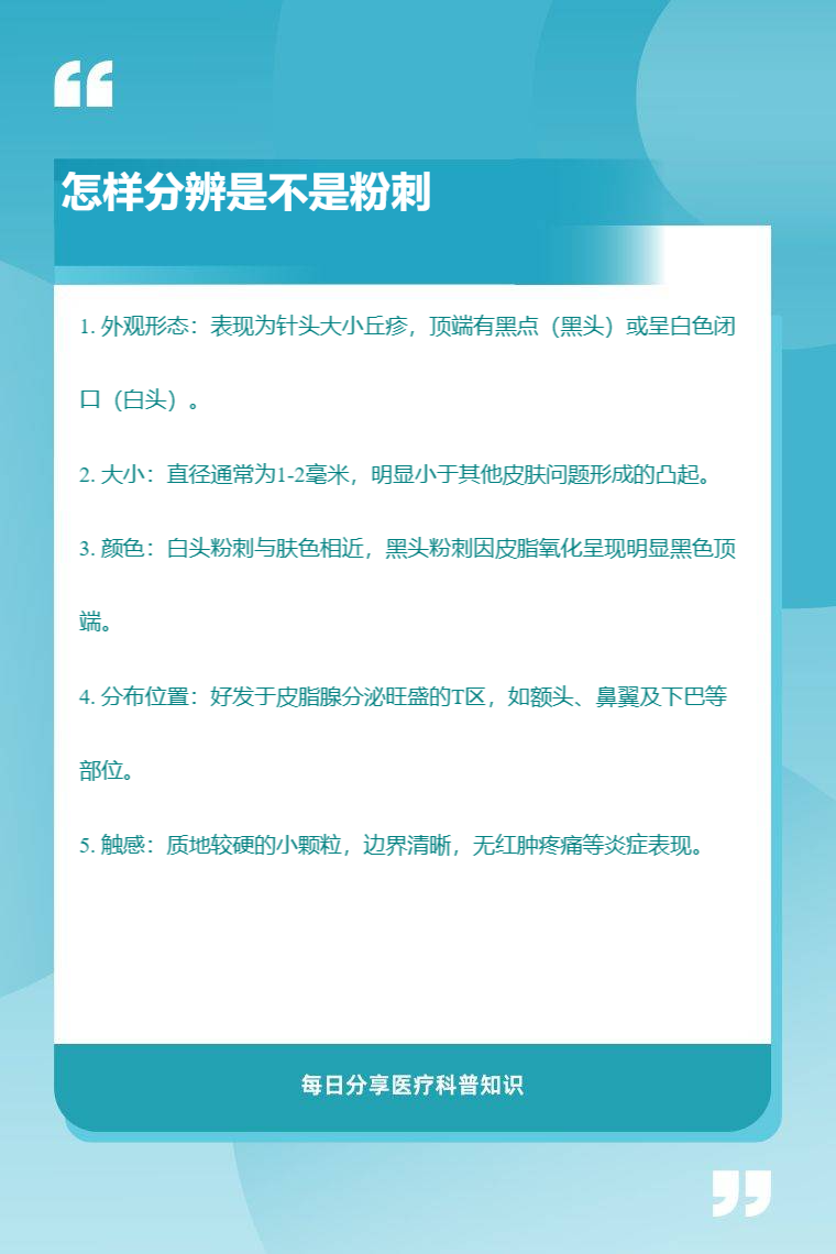 分辨是否为粉刺可从外观形态、大小、颜色、分布位置、触感等方面判断。