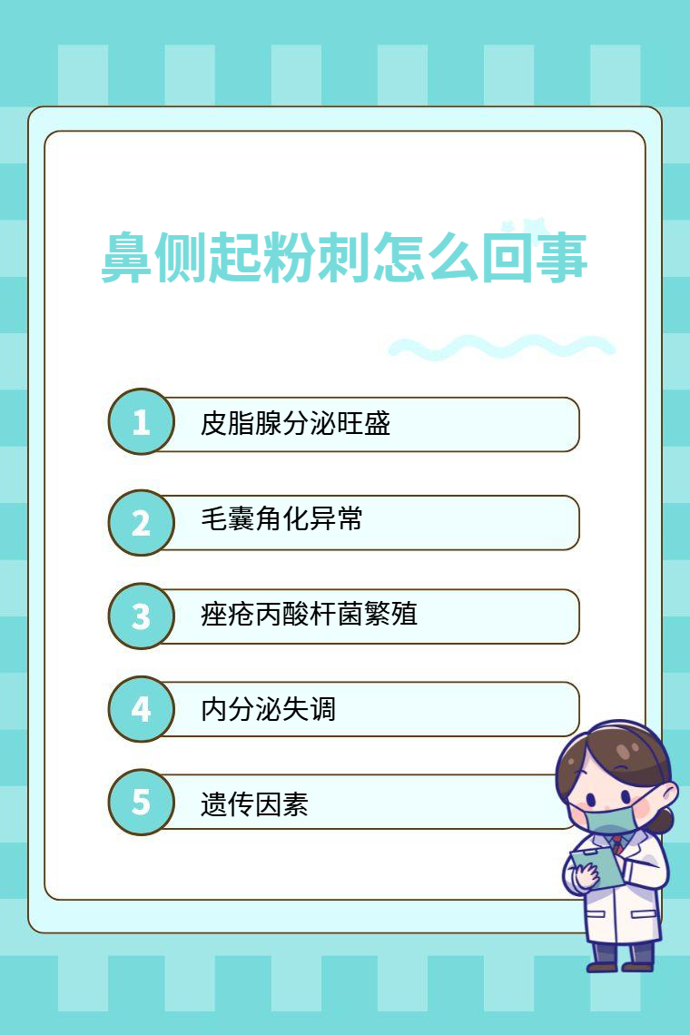 鼻侧起粉刺通常与皮脂腺分泌旺盛、毛囊角化异常、痤疮丙酸杆菌繁殖、内分泌失调、遗传因素等有关。