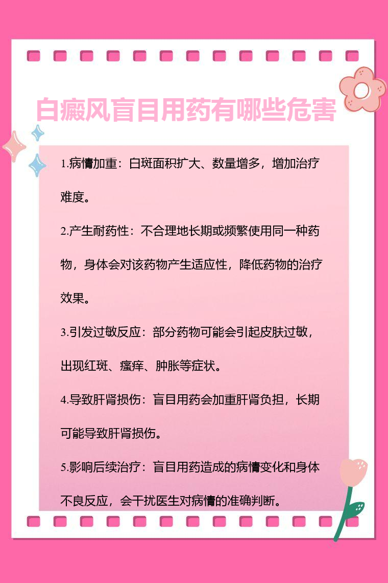 白癜风盲目用药可能带来病情加重、产生耐药性、引发过敏反应、导致肝肾损伤、影响后续治疗等危害。