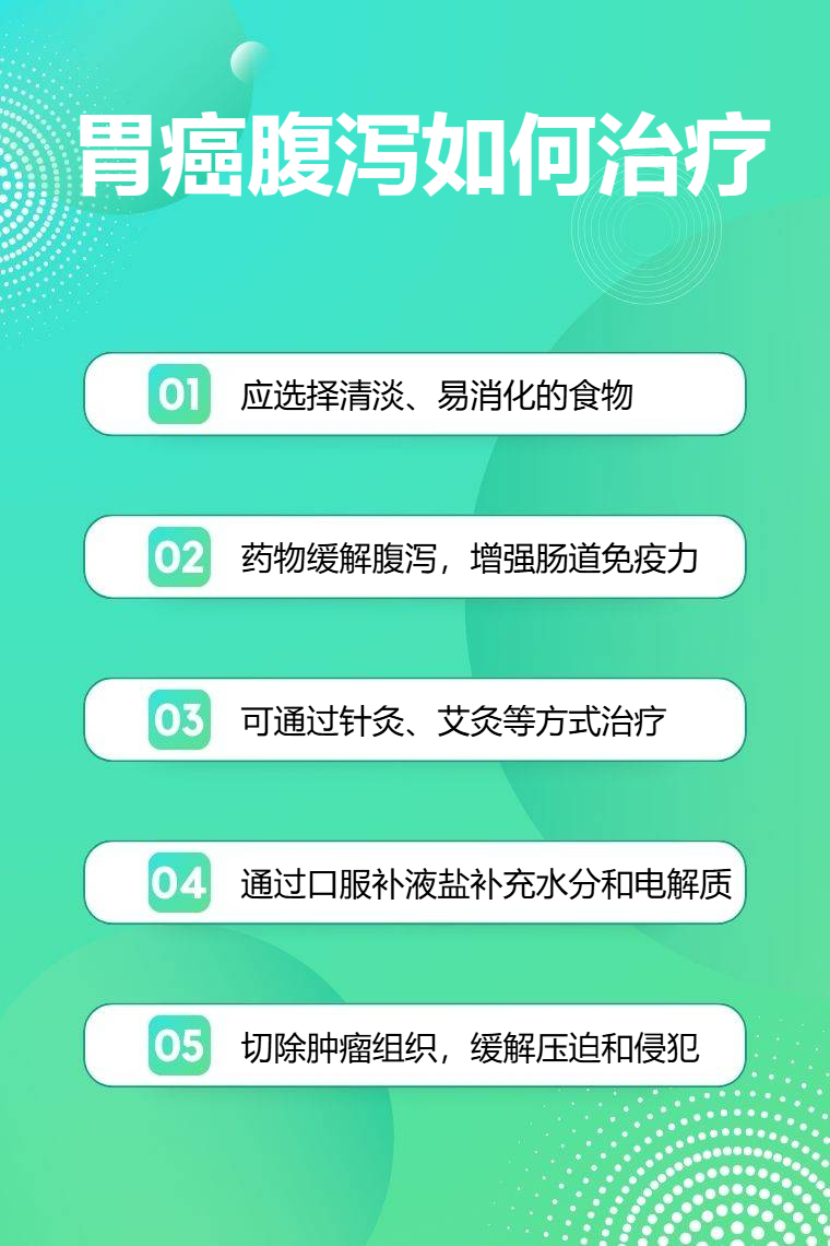 胃癌腹泻的治疗可通过饮食调整、药物治疗、中医调理、补液支持、手术治疗等。