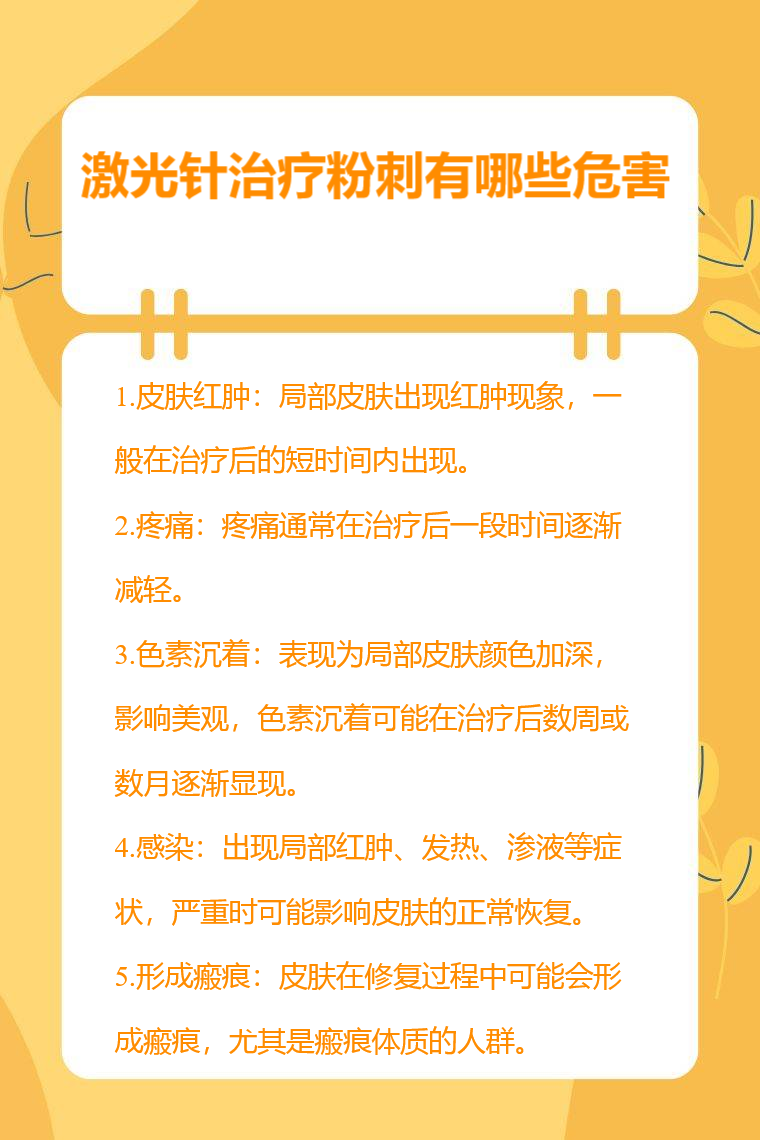 激光针治疗粉刺可能存在皮肤红肿、疼痛、色素沉着、感染、形成瘢痕等危害。