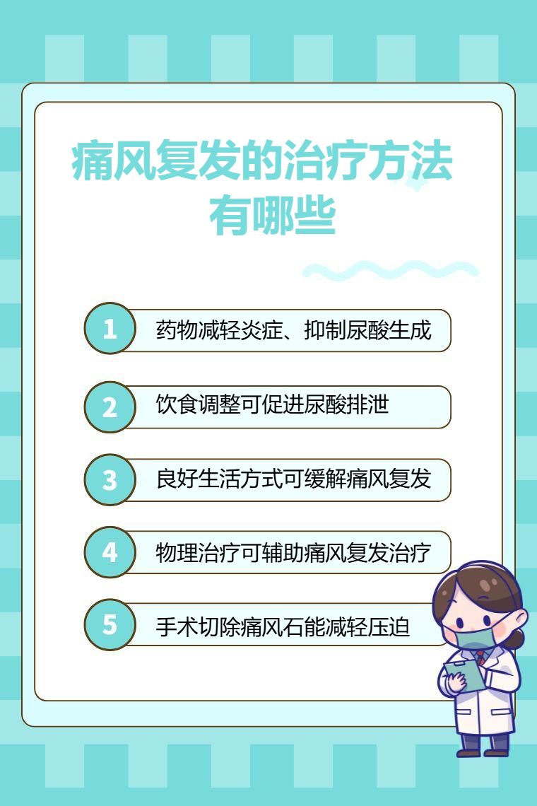 痛风复发的治疗方法有药物治疗、饮食调整、生活方式改善、物理治疗、手术治疗等。