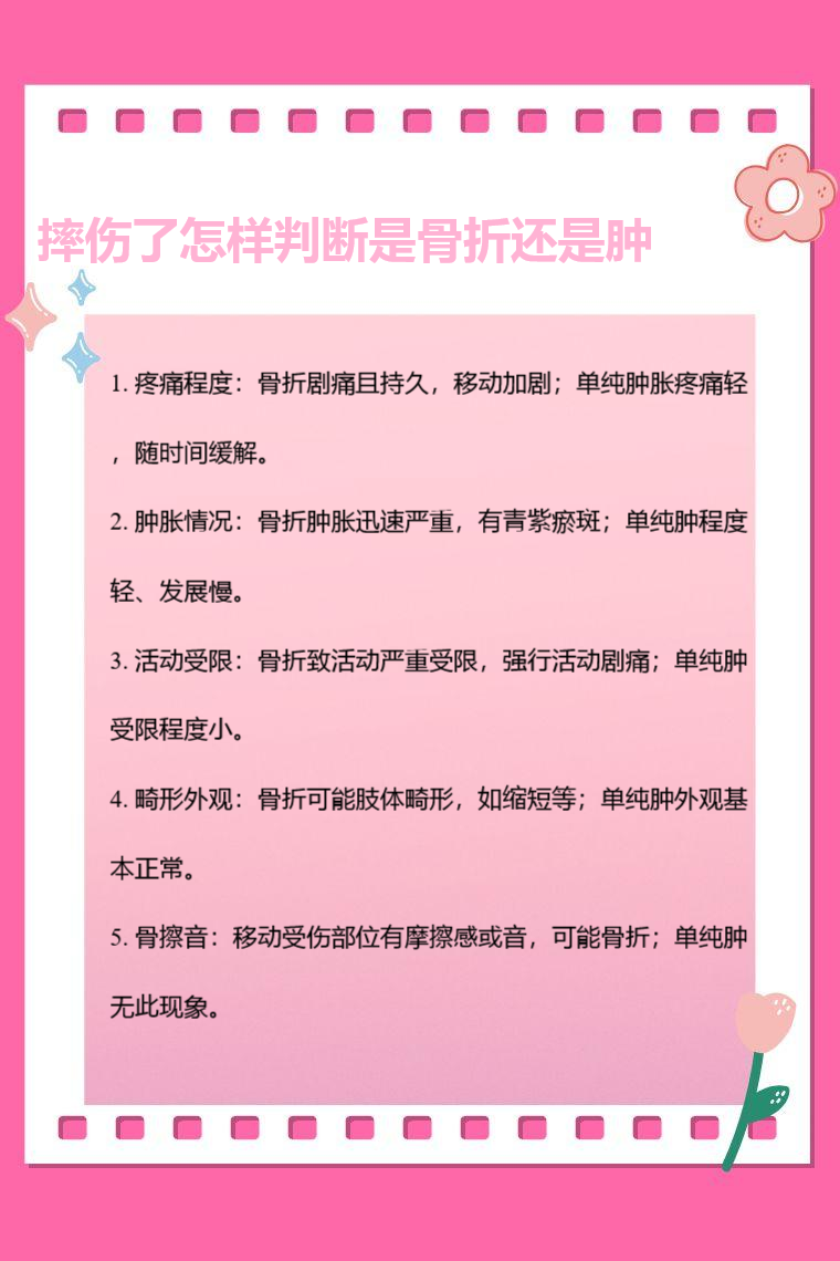 5. 骨擦音:在轻轻移动受伤部位时,若感觉到有摩擦感或听到类似骨头摩擦的声音,很可能是骨折;单纯肿一般不会出现这种骨擦音。