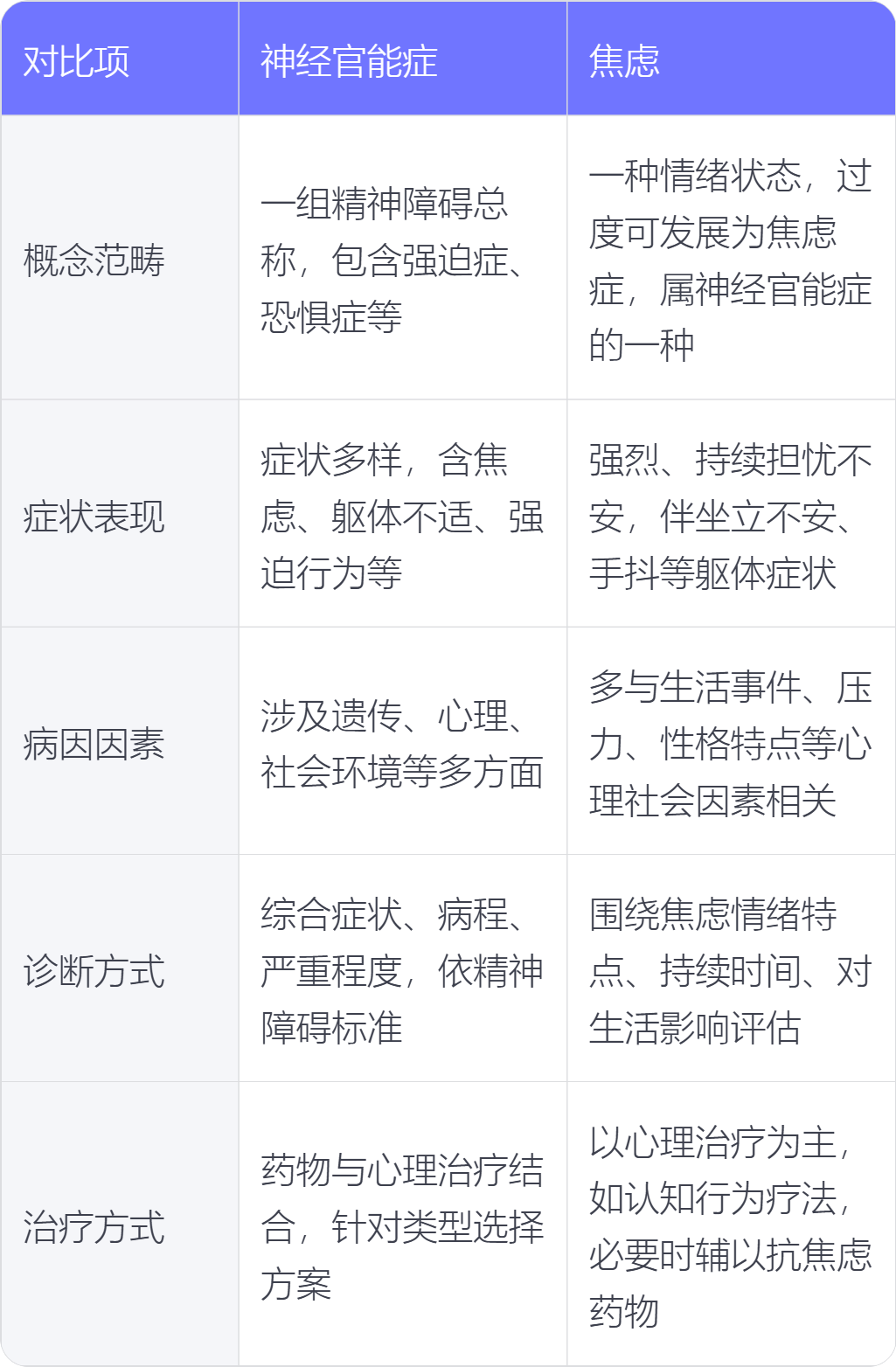 1. 概念范畴:神经官能症是一组精神障碍的总称,包含多种类型,如强迫症、恐惧症等;焦虑是一种情绪状态,过度且持续的焦虑可发展为焦虑症,属于神经官能症中的一种。