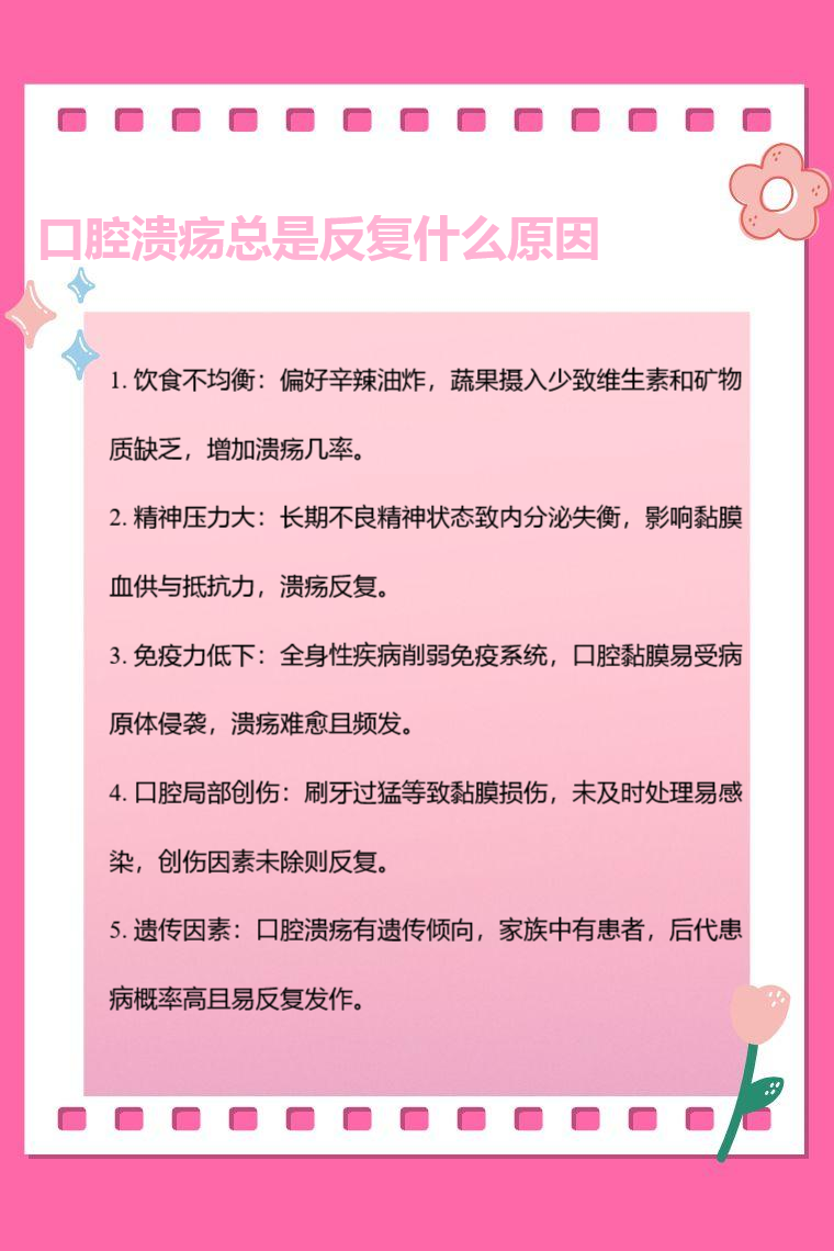 口腔溃疡总是反复的原因有饮食不均衡、精神压力大、免疫力低下、口腔局部创伤、遗传因素等。