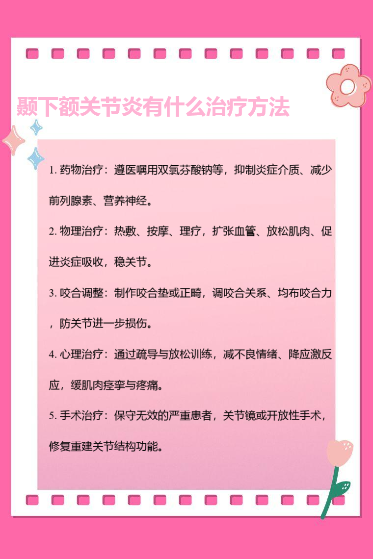 颞下颌关节炎的治疗方法有药物治疗、物理治疗、咬合调整、心理治疗、手术治疗等。