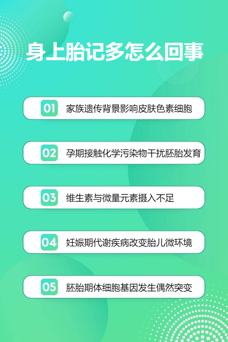身上胎记多可能由遗传因素、环境因素、孕期营养、孕期疾病、基因突变等情况导致等。