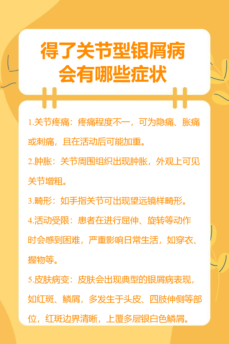 关节型银屑病症状有关节疼痛、肿胀、畸形、活动受限、皮肤病变等。