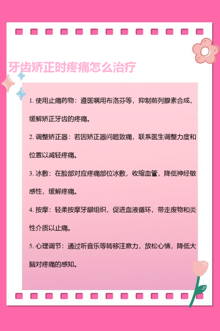 牙齿矫正时疼痛可通过使用止痛药物、调整矫正器、冰敷、按摩、心理调节等方法缓解。