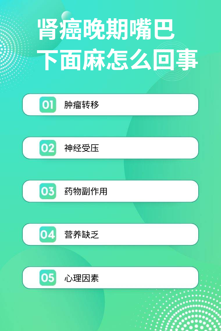 肾癌晚期嘴巴下面麻可能是由肿瘤转移、神经受压、药物副作用、营养缺乏、心理因素等。