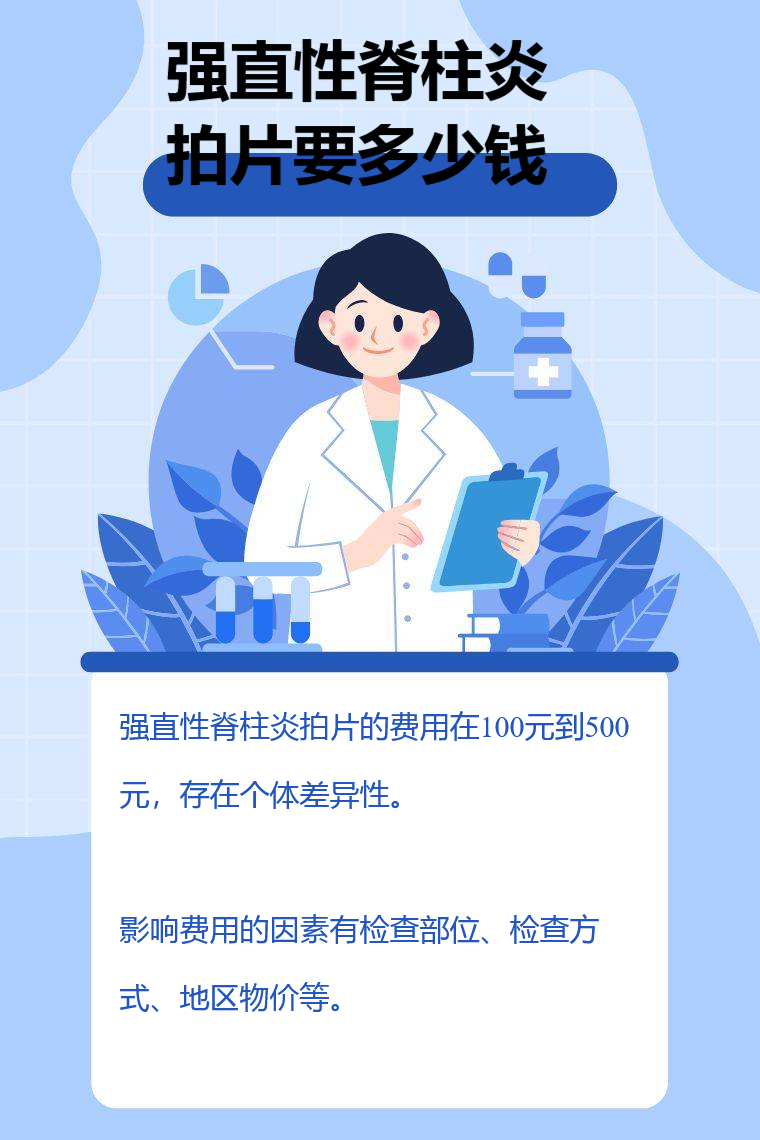 强直性脊柱炎拍片的费用在100元到500元,存在个体差异性。影响费用的因素有检查部位、检查方式、地区物价等。