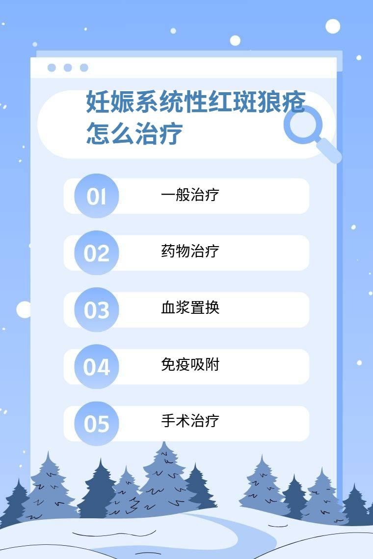 妊娠系统性红斑狼疮的治疗方法包括一般治疗、药物治疗、血浆置换、免疫吸附、手术治疗等。