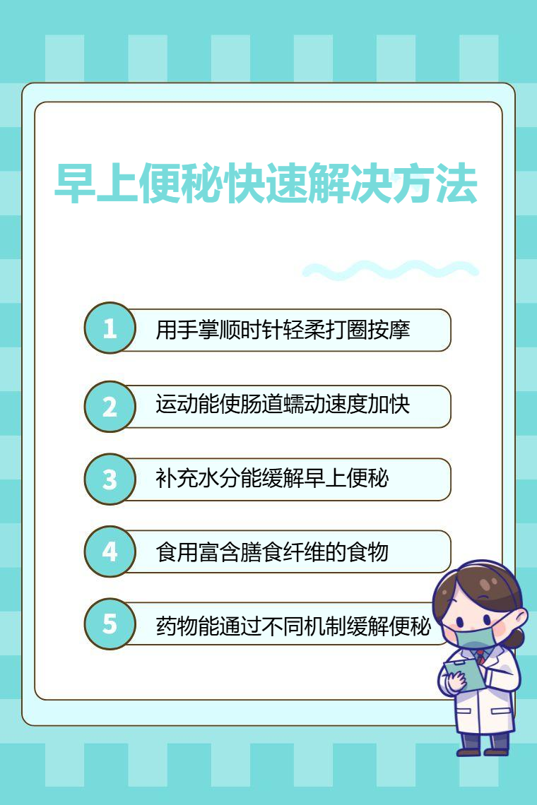 早上便秘可通过腹部按摩、适量运动、补充水分、调整饮食、使用药物等快速解决。
