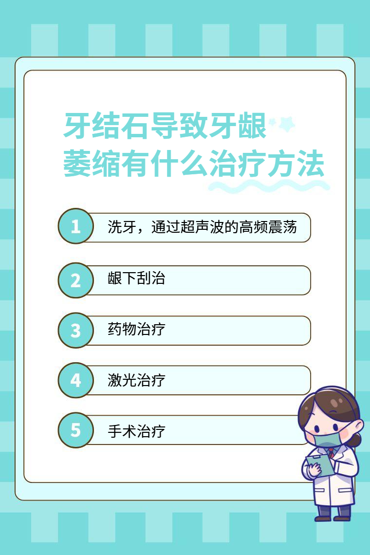 牙结石导致牙龈萎缩的治疗方法有洗牙、龈下刮治、药物治疗、激光治疗、手术治疗等。